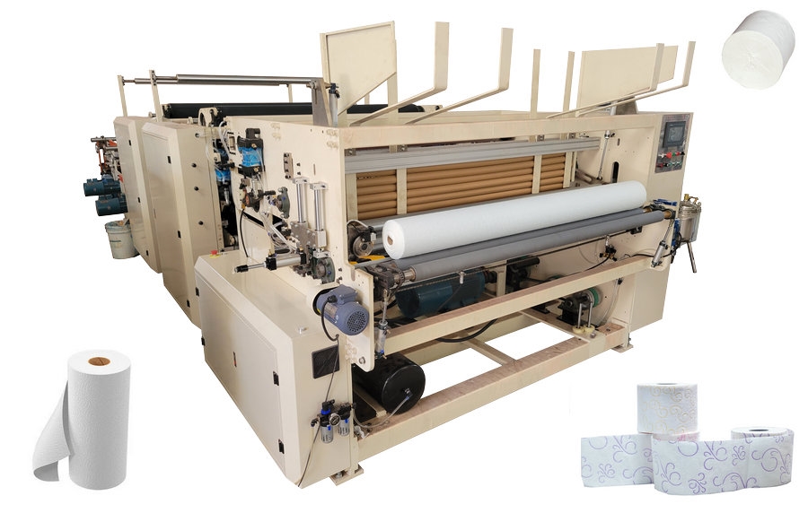 本機是加工寬1.2米\1.75米\1.95米\2.15米\2.35米\2.55米\2.75米的原紙, 本機主要由原紙架, 壓送紙機構、壓花機構、滾膠機構、打孔機構、收卷機構,電控機構、分切系統. 生產流程是:放卷—→壓紋—→上膠—→打孔—→收卷—→分切.